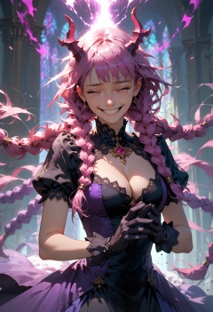 1girl, aura the guillotine, black gloves, cleavage, crying, dress, gloves, horns, long hair, pink hair, purple hair, smile, solo, twin braids, score_9,score_8_up,score_7_up,masterpiece,best quality,8k,
