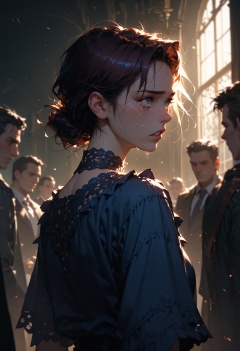 The woman's back is turned to the audience, looking back to the audience, a look of despair in her eyes, tears streaming down, shot from top to bottom, dark style, rich colors, dark colors, dim light, score_9,score_8_up,score_7_up,masterpiece,best quality,8k,