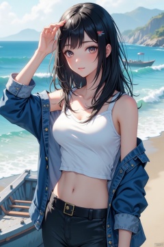 This is a real high-definition photo,This is a high-resolution, casual half-body portrait photo. The subject of the photo is a young woman wearing a white **** top and a denim jacket, with the sleeves of the jacket rolled up. She has black hair that falls over her shoulders. Her right hand is raised, shielding it from the sun, as if she is enjoying the seaside view. The background shows a beach and the ocean, with waves crashing against the shore and a small boat moored on the beach.