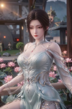(((black hair))),(Sitting on the lotus pond porch:1.49) ,(A pond full of pink lotus flowers:1.5),close up of 1girl,Hairpins,hair ornament,hair wings,slim,narrow waist,perfect eyes,beautiful perfect face,pleasant smile,perfect female figure,detailed skin,charming,alluring,seductive,erotic,enchanting,delicate pattern,detailed complex and rich exquisite clothing detail,delicate intricate fabrics,
