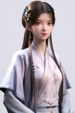 1girl, solo, jewelry, chinese clothes, long sleeves, hanfu, dress, simple background, white background, (upper body:1.2), standing, looking at viewer,