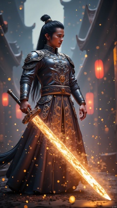 sword, Longquan swordA handsome Chinese young man dressed in silver science fiction armor,holding a luminous sword,exquisite five palaces,perfect face,(sword in hand golden lightning effect 1.3) cyberpunk style,night,cyberpunk city,good perspective lens,perfect back,perfect sword,masterpiece,best quality,8k super realistic,3D rendering,< Dream Tech XL | dream building industry XL, zhumeng Industry | Yujian Longyin XL>,A handsome Chinese young man,Summoning A glowing transparent Chinese Dragon,