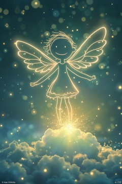 light line art,A whimsical illustration of a young girl with wings,floating on an ethereal cloud amidst sparkling lights.,Light lines