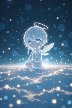 light line art,A whimsical illustration of a young girl with wings,floating on an ethereal cloud amidst sparkling lights.,