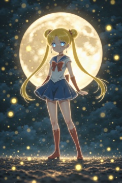 light line art, Sailor Moon, Sailor Moon, real-person photography, COSPLAY, sailor suit, red bow, yellow hair, twin tails, real shot, realistic photography, real person, beauty, huge moon behind, retro photography, Showa era, half-length Image, high contrast, light and shadow details, hairline light, super dreamy filter, super dreamy, retro filter, soft light effect