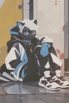 HTTP,1boy, cat, animal ears, white hair, male focus, sitting, black footwear, jacket, black cat, pants, shoes, jewelry, looking at viewer, necklace, short hair, animal, solo, grey eyes, collar, sneakers, black pants, black shirt, long sleeves, furry,
