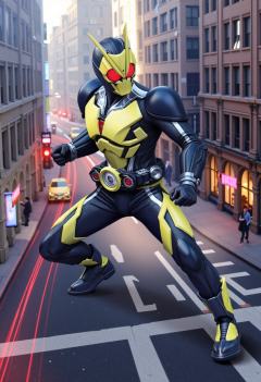 microarchitecture, abstract from above, KamenRider zero, a handsome boy fight stance on city street, buildings