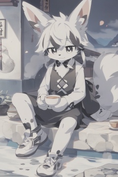 score_9, score_8_up, score_7_up, score_6_up, score_5_up, score_4_up, score_9, cute furry full body, chinese ink paint style, black fur, white eyes, drooping ears, white robe, black cuff, black ribbon, glimmering eyes, relaxed , smelling tea, mountains and rivers, boat, clouds, foggy, shota,black skin,fursuit