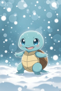 light line art, Squirtle in the snow, a cute Pokémon in a Disney style with cute big eyes and a happy smile, like a cartoon character, in pastel colors, on a simple background, shot full body, shot with a wide angle lens , in ultra-high definition.