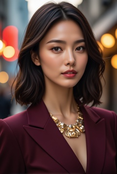 Depict a close-up of a beautiful city woman with flawless, radiant skin and striking features. Her eyes are captivating, framed by long lashes, and her lips are painted a bold, modern shade. Her sleek, shoulder-length hair is styled in a chic bob, adding to her fashionable appearance. She wears a cutting-edge, high-fashion ensemble—a tailored, asymmetrical blazer in a wine red with bold metallic gold accents, paired with a statement necklace that gleams in the soft city light. The texture and fabric of her outfit exude luxury, perfectly complementing her confident, poised expression. In the background, blurred city lights twinkle, emphasizing her place as a trendsetter in the urban landscape. BREAK detailed exquisite face,masterpiece,best quality,32K,UHD,HDR,realistic,detailed,sharp focus,high contrast,rule of thirds,depth of perspective,award-winning photo,chiaroscuro lighting
