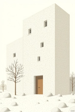 OBdianz, An eye-level view of a white building with black dots all over it. The building has a brown door in the middle of it. There are two bare trees on either side of the door. The ground below the building is covered in small rocks. The background of the image is a solid white color.