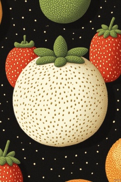 and another orange on the right side. There are green leaves at the top of the strawberries.