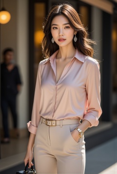 A 20-year-old elegant and sophisticated city woman is wearing a luxury silk blouse and high-waisted pants. The pastel-toned blouse features metallic details, and the pants fall neatly just above the ankles. She pairs black stiletto heels with a designer mini bag, accessorized with diamond earrings of chanel logo and a slim gold watch. Her look is completed with natural wavy hair and neutral-toned makeup, exuding refined city style