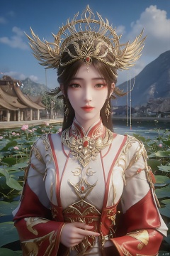 1girl, solo, breasts, looking at viewer, brown hair, black hair, hair ornament, dress, cleavage, jewelry, big breasts, upper body, earrings, parted lips, chinese clothes,Xdajisi,(Lotus, lotus pond, ancient Chinese architecture, blue sky and white clouds:1.29),,XhuolingerXjinpinger,Xluxueqi,Xtifa,Xyuanyao,Xhuijin