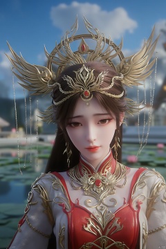 1girl, solo, breasts, looking at viewer, brown hair, black hair, hair ornament, dress, cleavage, jewelry, big breasts, upper body, earrings, parted lips, chinese clothes,Xdajisi,(Lotus, lotus pond, ancient Chinese architecture, blue sky and white clouds:1.29),,XhuolingerXjinpinger,Xluxueqi,Xtifa,Xyuanyao,Xhuijin
