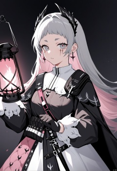 best quality, masterpiece, 1girl, solo, irene \(arknights\), gloves, scar across eye, black gloves, long hair, lantern, holding, scar, weapon, grey hair, sword, scar on face, grey eyes, parted lips, looking at viewer, holding lantern, head wings, long sleeves, jacket, black jacket, earrings, pink hair, jewelry, skirt