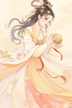 1girl, solo, black hair, hair ornament, long sleeves, dress, holding, jewelry, flower, earrings, hair flower, chinese clothes, tassel, shawl, hanfu