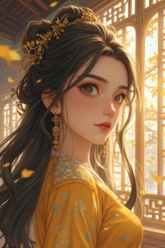 1girl, solo, long hair, black hair, hair ornament, dress, jewelry, upper body, earrings, parted lips, day, indoors, hair bun, tree, looking to the side, window, leaf, chinese clothes, sunlight, yellow dress, architecture, falling leaves, lattice