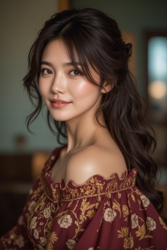 20 year beautiful face Girl with flirtatious smile,  Full body portrait,  beautiful face,  curly luxuriant hair,  incredible detail,  high detail,  gorgeous face,  pale flawless skin,  voluminous dress,  composition. Beautiful ideal face,  beautiful expressive look,  looking at camera,  perfect anatomy. A beautiful cinematic impressionistic picture,  Mysterious,  ultra hd,  realistic,  vivid colors,  highly detailed,  UHD drawing,  pen and ink,  perfect composition,  beautiful detailed intricate insanely detailed octane render trending on artstation,  8k artistic photography,  photorealistic concept art,  soft natural volumetric cinematic perfect light, leonardo style. ek_g1rl_02,ek_art_b00ster