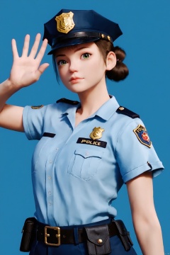 1girl, solo, looking at viewer, simple background, (police_uniform:1.2), closed mouth, waving, closed mouth, cowboy shot, blue background, ,