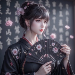 1girl, with a black kimono adorned with flowers. Her hair is pulled back in a bun cascading down her shoulders framing her face. She is adorned with a bold red lip adding a pop of color to her outfit. Her eyes are a piercing blue her eyebrows are a darker shade of brown and her lips are a lighter shade of red. She's holding a black hand fan with a floral pattern on it adding depth to the scene. The background is blurred The background is a wall with Chinese characters written on it creating a stark contrast to the woman's outfit.sexy