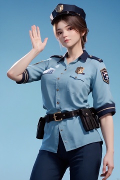 1girl, solo, looking at viewer, simple background, (police_uniform:1.2), closed mouth, waving, closed mouth, cowboy shot, blue background, ,