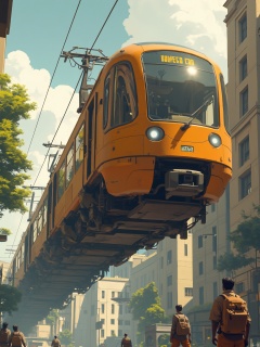 a vibrant orange train is suspended in the air above a city street. The train is adorned with a black bumper and a large window on the front. Two men are walking on the street below the train