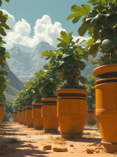 the sun shines down on a row of orange pots that have a black stripe on the side of them. The pots are filled with lush green leaves