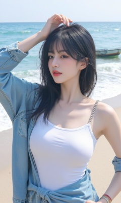 This is a real high-definition photo,This is a high-resolution, casual half-body portrait photo. The subject of the photo is a young woman wearing a white **** top and a denim jacket, with the sleeves of the jacket rolled up. She has black hair that falls over her shoulders. Her right hand is raised, shielding it from the sun, as if she is enjoying the seaside view. The background shows a beach and the ocean, with waves crashing against the shore and a small boat moored on the beach.<lora:网图-MYH-2:1>