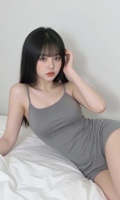 This is a real high-definition photo,<lora:网图-MYH-2:0.9>,This is a self-portrait photo with average clarity, with a lifestyle style. In the picture, there is a lady wearing a gray **** dress. Her hair is black. She is lying on the bed sideways, with one hand on her chest and the other stroking her hair. Her eyes are looking at the camera, and she appears to be between the ages of 20 and 30. She is female, with a fuller figure, a calm expression, wearing a gray **** dress, with black hair that falls to her shoulders, without bangs. The background is a white room.