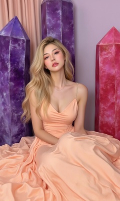 "The image features a young woman elegantly dressed in a peach-colored dress, surrounded by large, vividly colored crystals which vary in shades of purple and pink. She is seen sitting with a serene expression, her eyes gently closed, suggesting a moment of peaceful contemplation or reverie. Her long, flowing blonde hair and the soft, ruffled texture of her dress add a touch of grace and tenderness to the scene. The juxtaposition of the soft fabric against the sharp, natural geometry of the crystals creates a compelling contrast, emphasizing themes of beauty and tranquility amidst a fantastical setting. The overall ambiance is dreamlike and ethereal, with a predominant color palette of soft peach and various shades of purple and pink." <lora:网图-MYH-2:0.9>