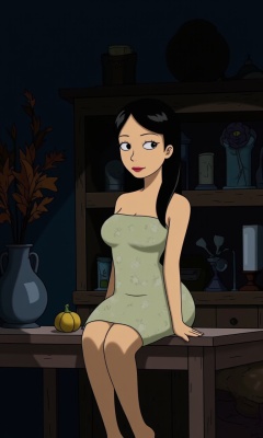 an East Asian woman with long, straight black hair and fair skin. She is seated on a wooden table, her body angled towards the camera, with one leg bent and the other extended. She wears a strapless, form-fitting dress in a soft pastel color with a subtle floral pattern. The dress accentuates her slender physique and small breasts. Her expression is calm and slightly pensive, with her eyes gazing directly at the camera.blue theme ,old color tone,cold,In her right hand, she holds a small, round, yellow gourd. The background is dimly lit, with a dark wooden shelf filled with various items, including a candle and a vase with dried flowers, adding a rustic, cozy atmosphere to the scene. To the left, there is a large, metal vase containing autumnal foliage in shades of orange and brown, contributing to the seasonal feel of the setting. The table she sits on has a smooth, polished finish, and the texture of the wood is evident. The overall mood of the photograph is serene and intimate, with a focus on natural beauty and simple elegance.This is a high-definition cartoon-style image. "The Simpsons.", <lora:辛普森v2:1>,