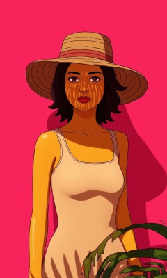 This is a high-definition cartoon-style image. "The Simpsons.", <lora:辛普森v2:1>,"The image portrays a woman standing against a vividly pink background. She is wearing a large, straw hat that obscures her facial features, adding a sense of mystery. Her attire includes a sleeveless top that matches her skin tone, creating a smooth, monochromatic effect. The setting includes palm fronds in the foreground, casting intricate shadow patterns across her face and body, enhancing the visual texture. The lighting is bright and seems to be natural, suggesting this photo was taken outdoors during the day. The overall feel is stylish and summery, with a focus on fashion and the interplay of light and shadow.",