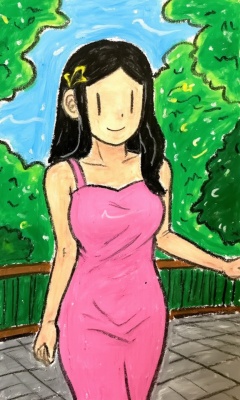 <lora:油画棒:1>,youhuabang-This is a high-resolution cartoon style image,In the picture, there is a woman wearing a pink sundress, her body facing the left side of the frame and her gaze fixed on the camera. She appears to be between the ages of 20 and 30, female, slim, with a calm expression. She is wearing a pink sundress, her hair is black, long and flowing without bangs. The background consists of green foliage and trees, while the sky is blue. Sunlight filters through the leaves, casting some dappled light on the woman's body.