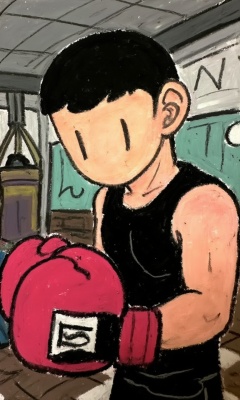 <lora:油画棒:1>,youhuabang-This is a high-resolution cartoon style image,The subject of the image is a young male wearing a black sleeveless top and boxing gloves, standing inside a gym. His expression is focused and serious, indicating that he is preparing for boxing training. His gaze is directed towards his gloves, perhaps checking if they fit properly. His physique is average, with visible muscle definition, suggesting good physical condition. His hair is short and neat, with a black color. In the background, one can see some fitness equipment, such as punching bags and iron frames. Overall, the image conveys a spirit of positivity, courage, and a readiness to take on challenges.