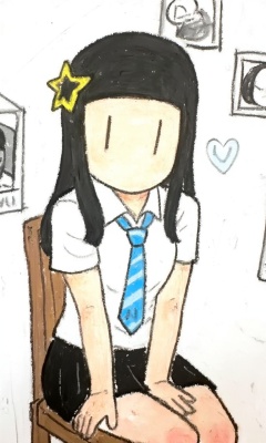 <lora:油画棒:1>,youhuabang-This is a high-resolution cartoon style image,In the picture, there is a woman wearing a white short-sleeved shirt and a black pleated skirt, with a blue and white striped tie. She has long black hair, sitting on a wooden chair with her hands resting on her knees, facing the camera, and her eyes are looking at the camera. She appears to be around 20 years old, slim, and her expression is calm. Her outfit consists of a white short-sleeved shirt, a blue and white striped tie, and a black pleated skirt. Her hair is flowing freely without bangs. The background is a white wall, hanging some black and white comics