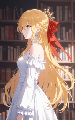 1girl, bare_shoulders, blonde_hair, blue_eyes, book, bookshelf, bow, braid, breasts, crown, detached_sleeves, dress, earrings, from_side, indoors, jewelry, long_hair, long_sleeves, medium_breasts, profile, red_bow, solo, very_long_hair, white_dress, wide_sleeves