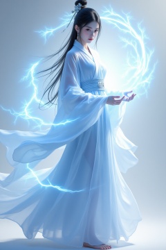 masterpiece,best quality,4k,highly detailed, award winning artwork,splash ink style,splash ink,ink splattered,ink splatter effects,ink wash painting background,1girl, standing, Transparent white gauze chinese traditional outfit,asian-inspired outfit, leifa, calligraphy characters,magic, (hand held electric arc:1.2),wrapped in electricity all over the body, ((blue electric arc)), meteor, glowing, sky, cloud, milky way, (simple background:1.4), blue theme, martial arts style, looking at viewer, (simple clothes:1.2), no weapon, fighting stance, masterpiece, best quality, 32k uhd, Epic CG masterpiece, hdr,dtm, full ha,8K, ultra detailed graphic tension, dynamic poses, stunning colors, cinematic lighting effects, realism, 00 renderer, super realistic, full - body photos, super vista, super wide Angle,bailing_magic_circle <lora:xian2:1>