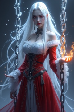 photo of a vampire queen,left hand grasp a chain with ice effect,right hand grasp a chain with fire effect,she wearing a victoria period with red and light blue color,long white hair,red eyes,the chain **** from steel and it floating in the air,big chain,focus on chain,1girl <lora:xian2:1.2>