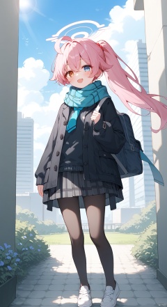 (score_9,score_8_up,score_7_up), 1girl,solo,(masterpiece:1.3),( beautiful:1.2),(high quality:1.2),(finely detailed:1.2),extremely detailed CG unity 8k wallpaper,best quality,a very delicate and beautiful,perfect fingers,1girl, solo, long hair, looking at viewer, blush, smile, open mouth, bangs, blue eyes, skirt, simple background, long sleeves, school uniform, standing, jacket, yellow eyes, ponytail, pink hair, ahoge, :d, pantyhose, pleated skirt, open coat, fang, bag, scarf, coat, orange eyes, plaid, black pantyhose, heterochromia, halo, plaid skirt, white footwear, skin fang, grey skirt, blue scarf, hoshino \(blue archive\), black sweater, black coat, , parted_lips, outdoors, blue sky,sunlight, clouds, school building,lawn, cowboy_shot, standing, hoshinoBA, looking_at_veiwer