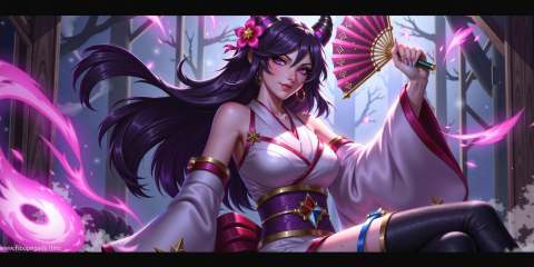 hezi, lol style, Splash art, Cool, game art, Game art, LOL propaganda poster texture, 1girl, hair ornament, holding, monster girl, kimono, japanese clothes, lamia, hair flower, breasts, long hair, black hair, bangs, flower, solo, hand fan, looking at viewer, glowing, long sleeves, large breasts, glowing eyes, hand up, smoke, wide sleeves, purple eyes, indoors, pink eyes, mermaid, detached sleeves, fingernails, holding fan, sitting, ghost, sharp fingernails, parted lips, scales, colored skin, horns, artist name, night, official alternate costume, snake, solo focus, jewelry, closed mouth, purple lips, medium breasts, petals, smoking pipe, bare shoulders, claws, animal, alternate costume, obi, smile, outdoors, hair stick, teeth, magic, long fingernails, sash, purple hair, comb, shiny, mole, folding fan