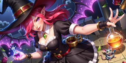 hezi, lol style, Splash art, Cool, game art, Game art, LOL propaganda poster texture, 1girl, breasts, hat, cleavage, pointy ears, potion, dress, puffy short sleeves, puffy sleeves, large breasts, hair over one eye, solo, short sleeves, wings, black dress, witch hat, long hair, magic, red hair, cat, alternate costume, bangs, pink hair, smile, witch, glowing, black headwear, jewelry, vial, holding, flask, parted lips, official alternate costume, medium breasts, looking at viewer, teeth, animal, gloves, belt, fire, creature, gem, outdoors, from above, hand up, flower, mouse, test tube, red lips, red eyes, short hair, plant, pink eyes, claws, artist name, glowing eyes, night, smoke, staff