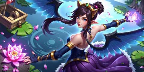hezi, lol style, Splash art, Cool, game art, Game art, LOL propaganda poster texture, 1girl, dress, pointy ears, wings, breasts, purple dress, water, magic, long hair, detached sleeves, lily pad, bare shoulders, medium breasts, jewelry, black hair, circlet, tiara, solo, feathered wings, bridal gauntlets, backless outfit, cleavage, elf, backless dress, blue eyes, looking at viewer, flower, fire, hair ornament, blue wings, lips, petals, glowing, earrings, artist name, from above, parted lips, standing, blue dress, solo focus, outdoors, brown hair, makeup, nail polish, closed mouth, low wings, bare back, feathers, outstretched arms, purple nails, eyeshadow, nose, single hair bun, fingernails, black wings, back, ripples, halterneck, hair bun, green eyes, long sleeves, feather trim, lotus, watercraft, looking back, fantasy, headpiece, bangs, purple flower, from behind, signature, strapless dress, large breasts, watermark, half-closed eyes, detached collar, boat, web address, ponytail, gem, black dress, strapless, puffy sleeves, lipstick, night