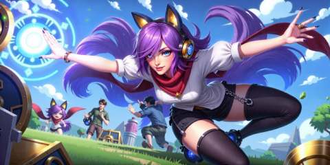 hezi, lol style, Splash art, Cool, game art, Game art, LOL propaganda poster texture, coin, 1girl, red scarf, ahri \(league of legends\), tail, bracelet, fox tail, animal ears, short sleeves, jewelry, nail polish, shorts, purple hair, headphones, blue eyes, joystick, scarf, alternate costume, mole, multiple tails, grass, thighhighs, hair over one eye, smile, fox ears, looking at viewer, shirt, black shorts, puffy short sleeves, purple nails, outdoors, puffy sleeves, mole under eye, white shirt, short hair, long hair, bangs, controller, alternate hair color, closed mouth, glowing, bangle, hood, dutch angle, game controller, swept bangs, signature, all fours, solo focus, solo, breasts, red cape, black nails, single thighhigh, day, shoes, magic, asymmetrical legwear, treasure chest, weapon, sky, striped, mismatched legwear, short shorts, cloud, official alternate costume, fake animal ears, speaker, running, gem, parted lips, on ground, fingernails, mask, ring, heart, medium breasts, glint, small breasts, lips, instrument, looking to the side, from side, cape, multiple boys, blue hair, standing, electricity, health bar, blue sky, alternate hairstyle, helmet, kneeling, bag, dice, hood up, artist name