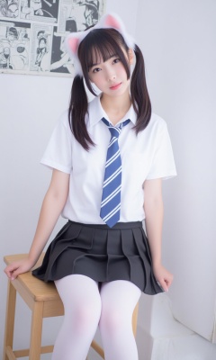 This is a clear mobile selfie photo with a daily style. In the picture, there is a woman wearing a white short-sleeved shirt and a black pleated skirt, with a blue and white striped tie. She has long black hair, sitting on a wooden chair with her hands resting on her knees, facing the camera, and her eyes are looking at the camera. She appears to be around 20 years old, slim, and her expression is calm. Her outfit consists of a white short-sleeved shirt, a blue and white striped tie, and a black pleated skirt. Her hair is flowing freely without bangs. The background is a white wall, hanging some black and white comics.White stockings, white pantyhose,,<lora:flux-test-loka12G:1>,