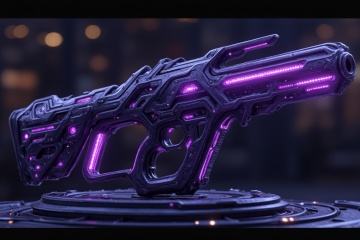 ultra-realistic highly detailed Image showcases a futuristic, sci-fi styled weapon sniper rifle with a sleek and intricate design. The weapon features a predominantly dark shiny metallic body with a series of glowing purple crystal accents and highlights running along its length. The barrel is elongated and segmented, with a distinct, angular structure that gives it a high-tech appearance. The rifle's body is adorned with various geometric patterns and cutouts, adding to its complexity and advanced look. sits on display padestal on high tech lab. The overall design suggests a blend of advanced technology and aesthetic appeal, making it appear as a weapon from a science fiction universe.,myth Dark Purple SR