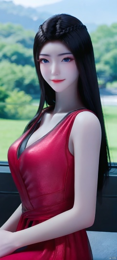 Close-up shot of a stunning 1girl sitting alone in a rustic setting, She is wearing a long red dress, with a cool colors light casting a gentle glow on her porcelain-detailed skin. Her gaze meets the viewer's, an invitation to connect as she wears subtle light makeup that accentuates her natural beauty. The camera captures every nuance, from the subtle curve of her smile to the sparkle in her eyes, all set against a richly textured backdrop.
