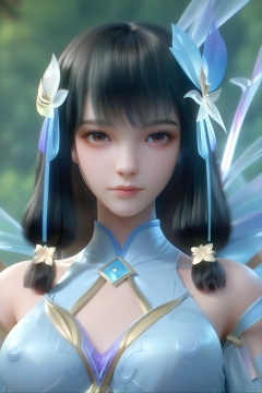score_9, score_8_up, score_7_up,highly detailed digital,1girl, solo, looking at viewer, bangs, black hair, hair ornament, dress, brown eyes, closed mouth, upper body,  realistic,She has pale, almost translucent skin,yunluo