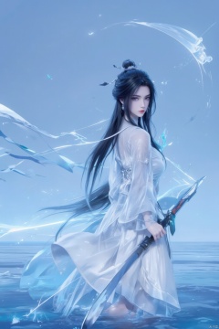 1girl, solo, long hair, looking at viewer, blue eyes, black hair, hair ornament, dress, holding, weapon, sword, water, hair bun, holding weapon, white dress, see-through, expressionless, holding sword, single hair bun, blue theme