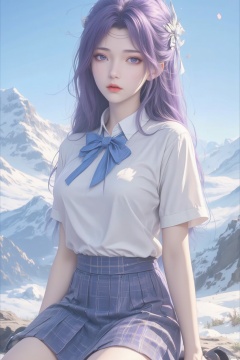 1girl, solo, long hair, looking at viewer, skirt, shirt, bow, ribbon, sitting, school uniform, purple eyes, full body, hair ribbon, white shirt, purple hair, short sleeves, pleated skirt, outdoors, sky, shoes, day, socks, collared shirt, bowtie, black footwear, blue sky, blue skirt, plaid, blue bow, plaid skirt, white socks, loafers, mountain, blue bowtie